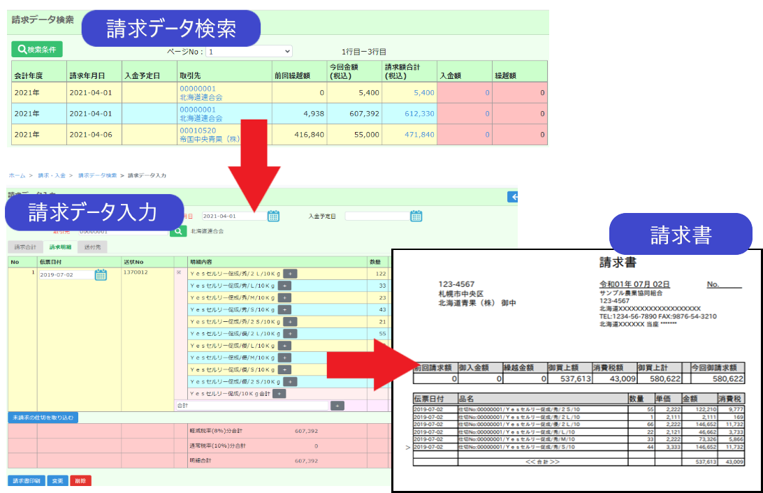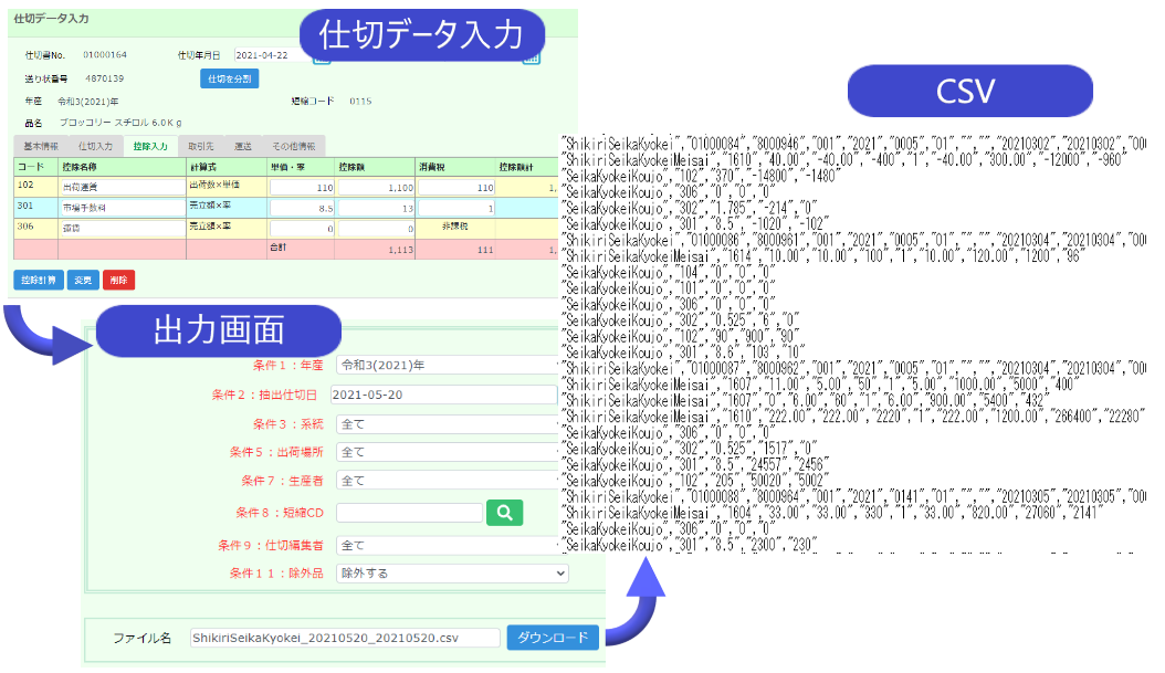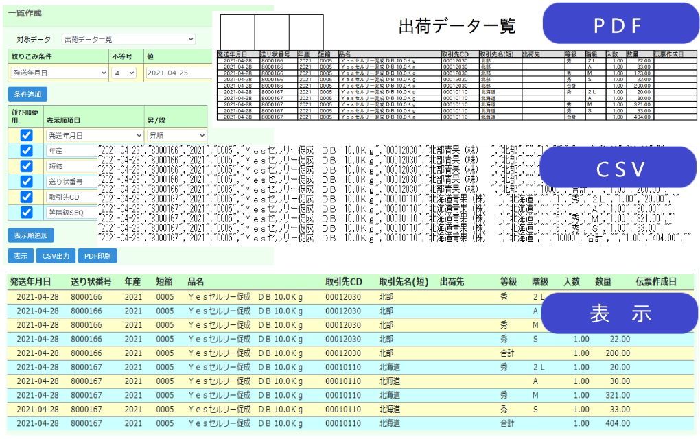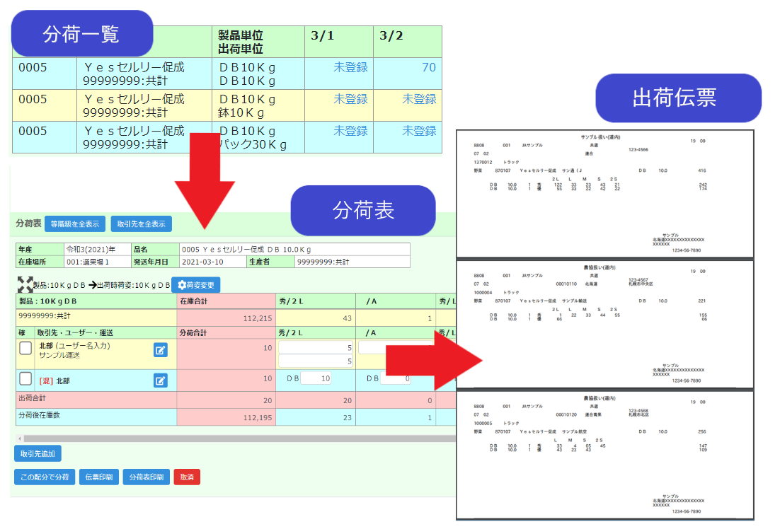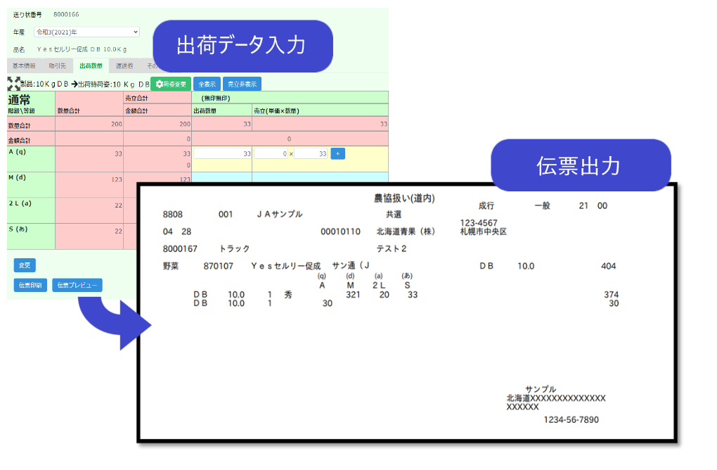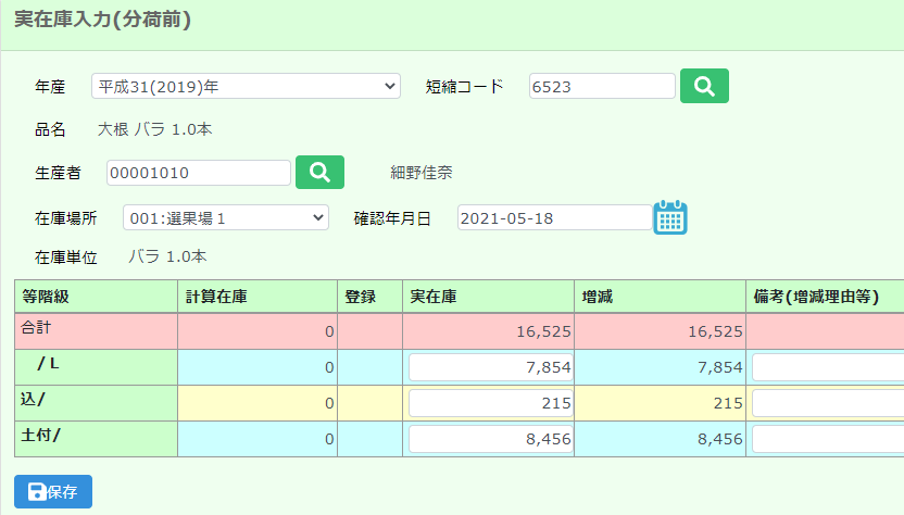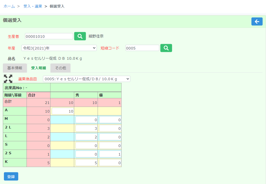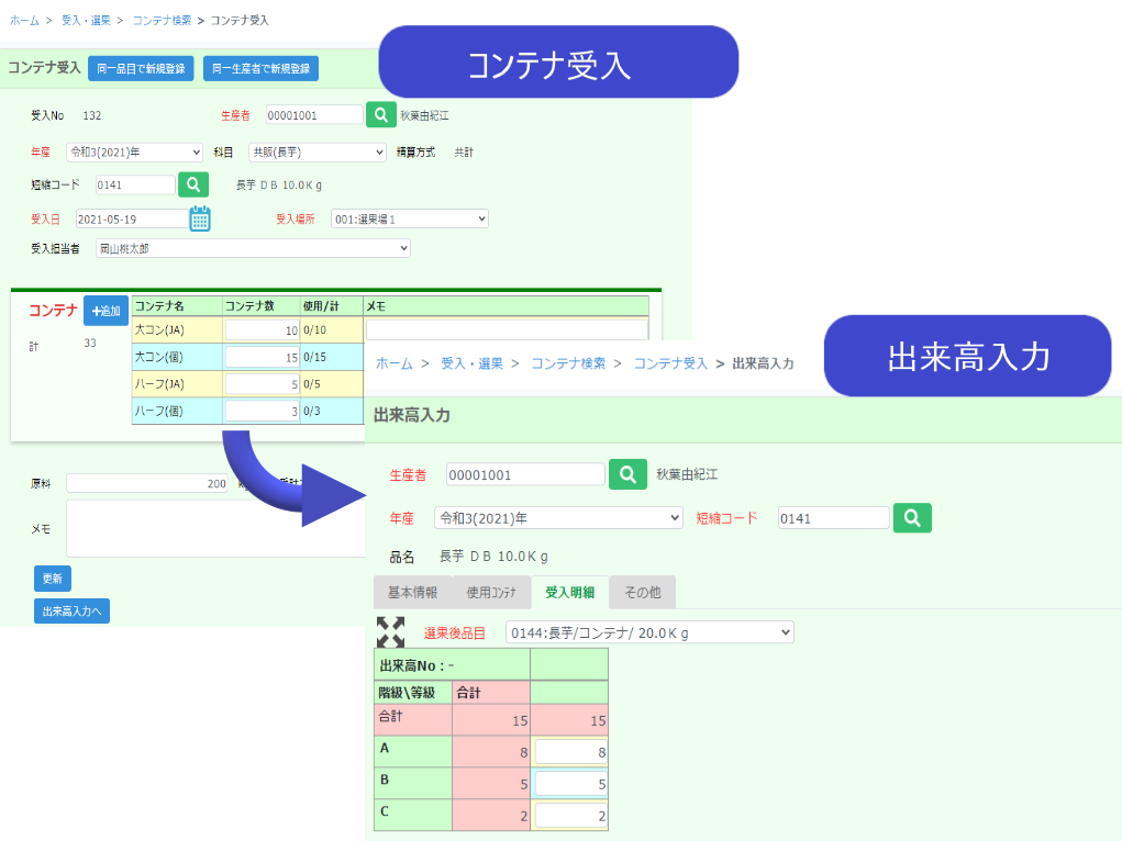 コンテナ受入の内容をもとに選果結果の入力が可能
